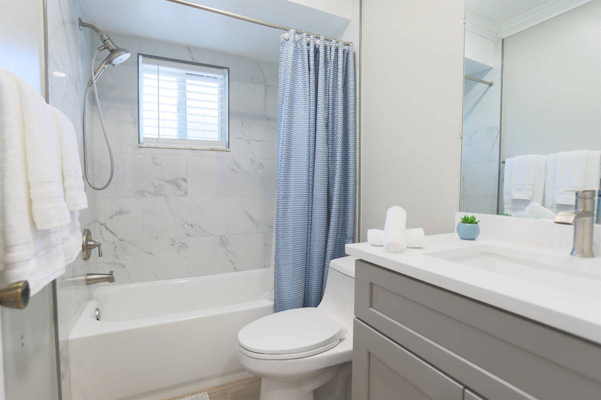 • 2 bathrooms: one with walk-in shower and one with bathtub