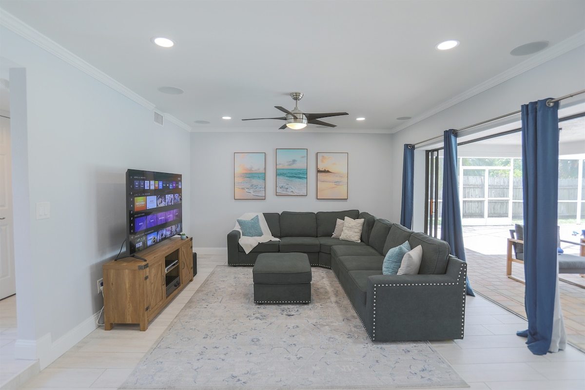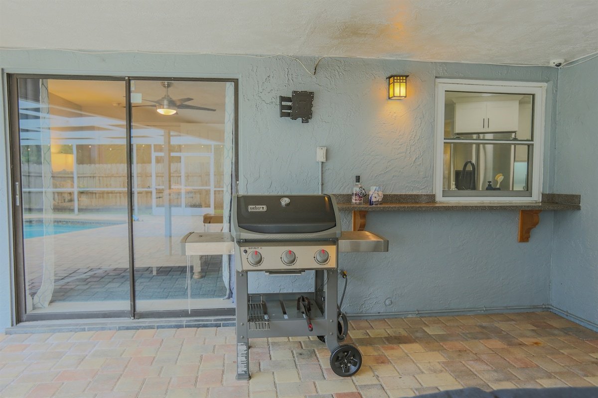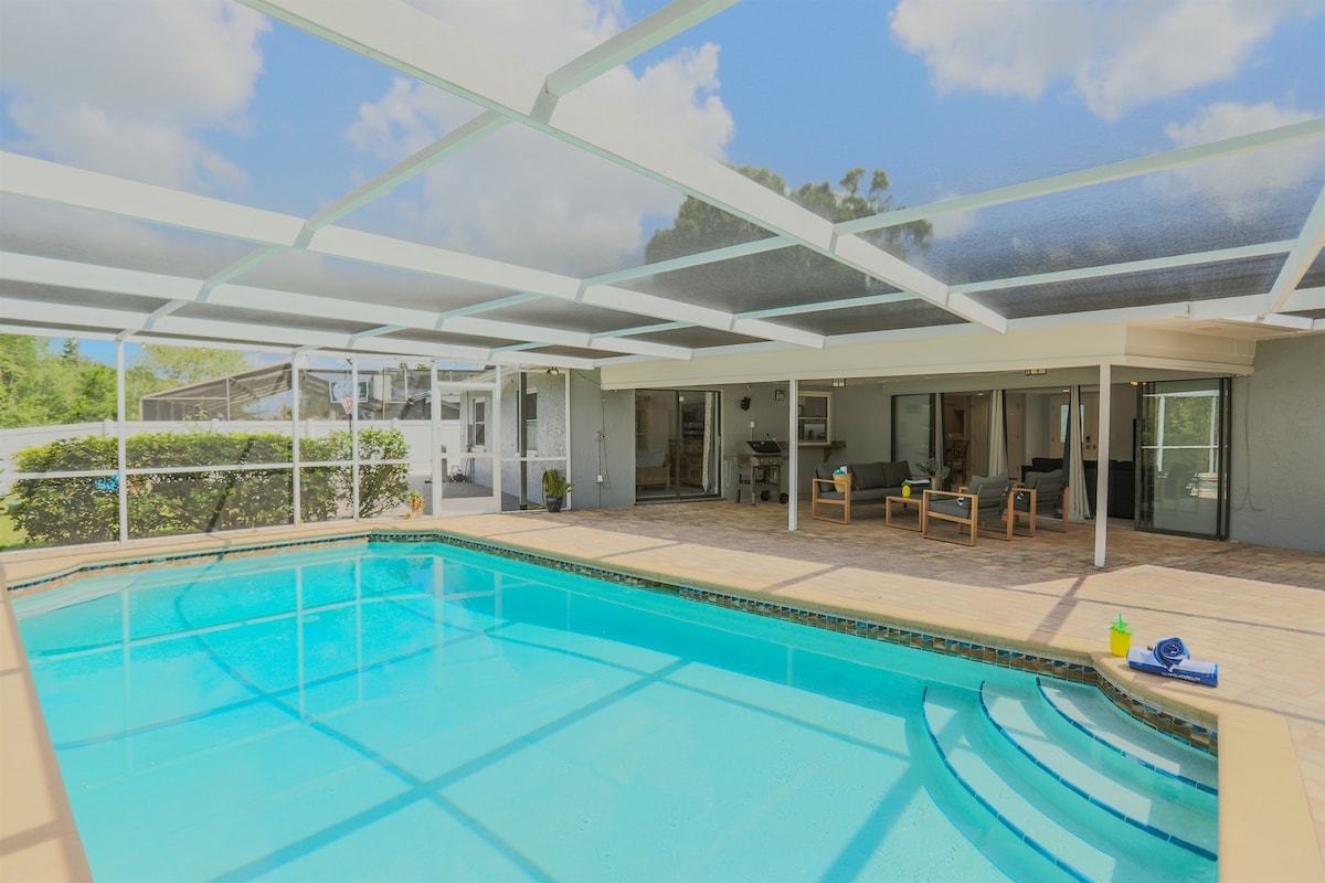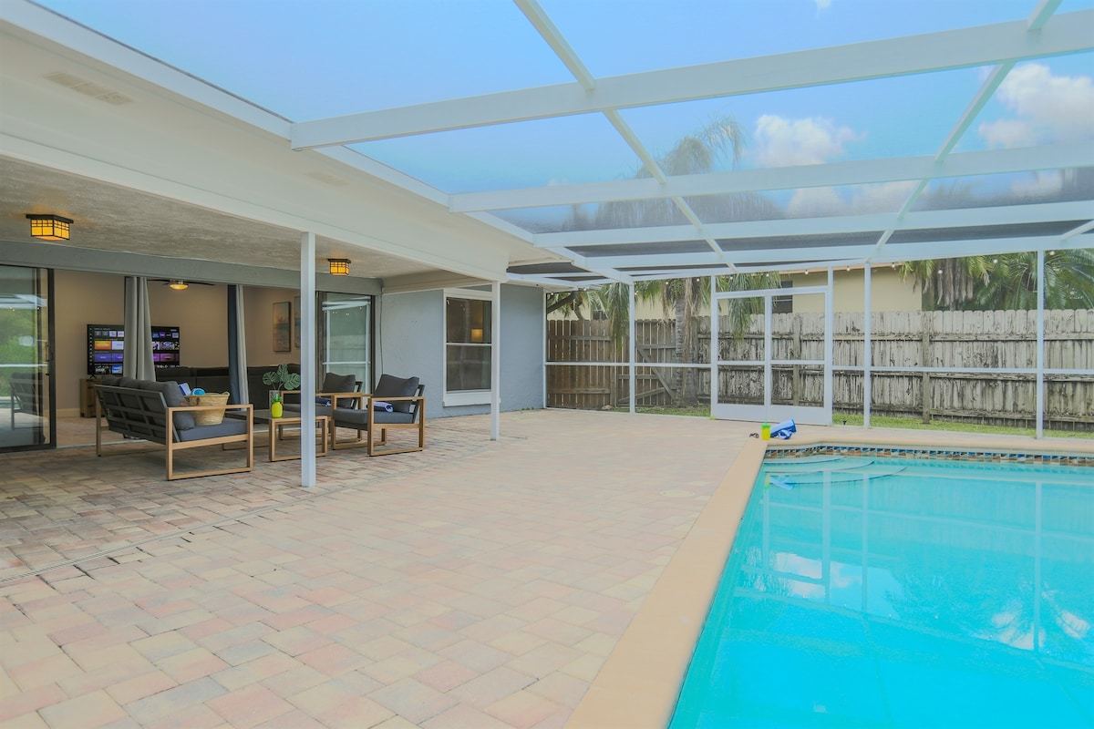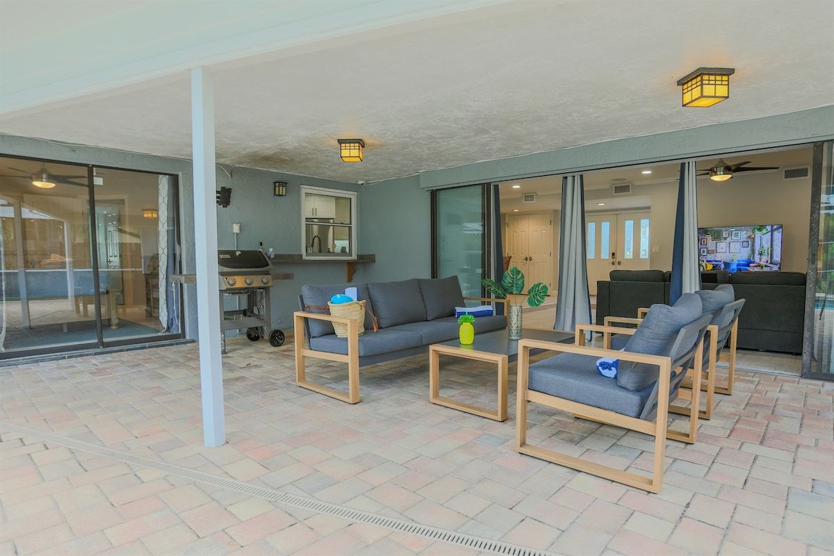 Relax at Sunset Poolhouse — a fully renovated 4 bedrooms retreat in Clearwater with a private pool, firepit, BBQ grill, outdoor seating, games, and sunset views over a serene creek (no rear neighbors!). Enjoy Xbox 360 in the bunk bed kids' room, smart TVs in all bedrooms, a full kitchen, and ample parking. Just 15 mins to Clearwater, Belleair, and Indian Rocks Beach!