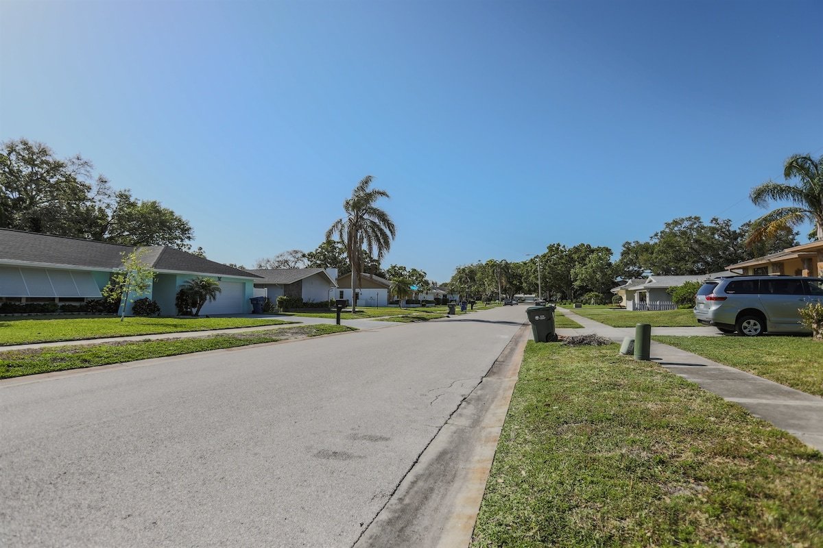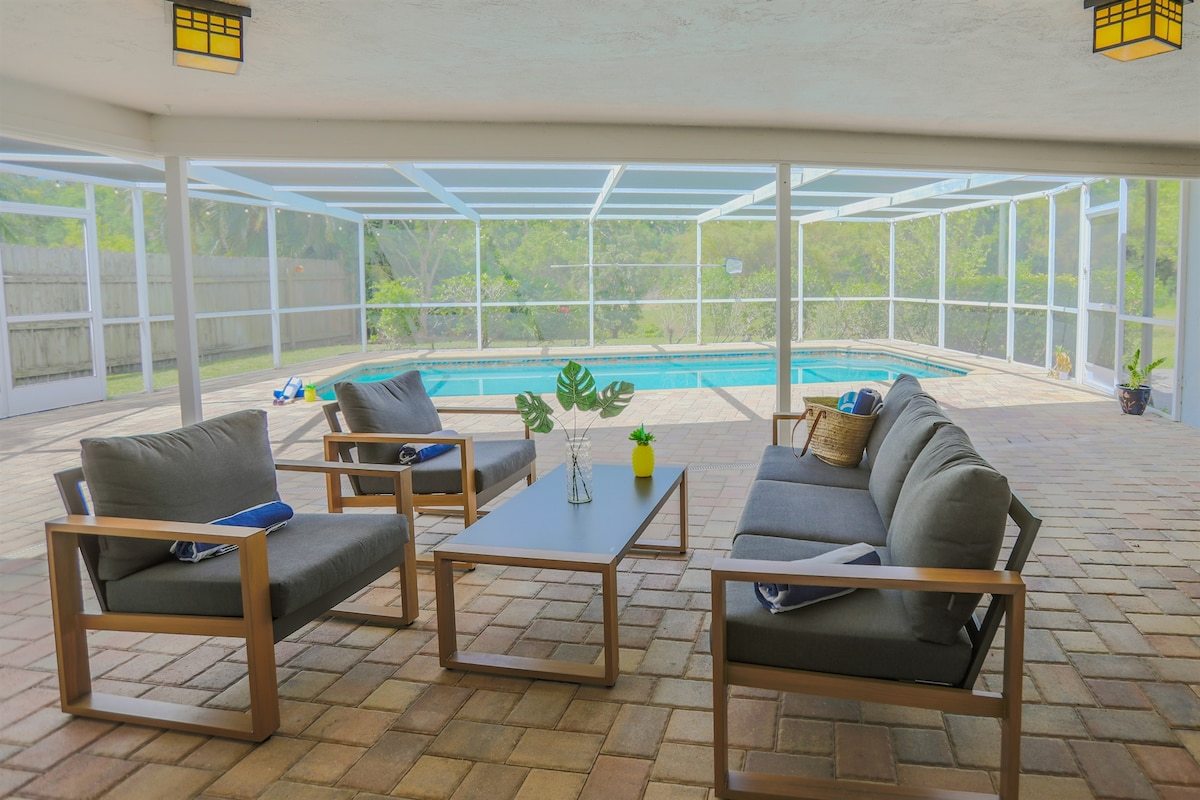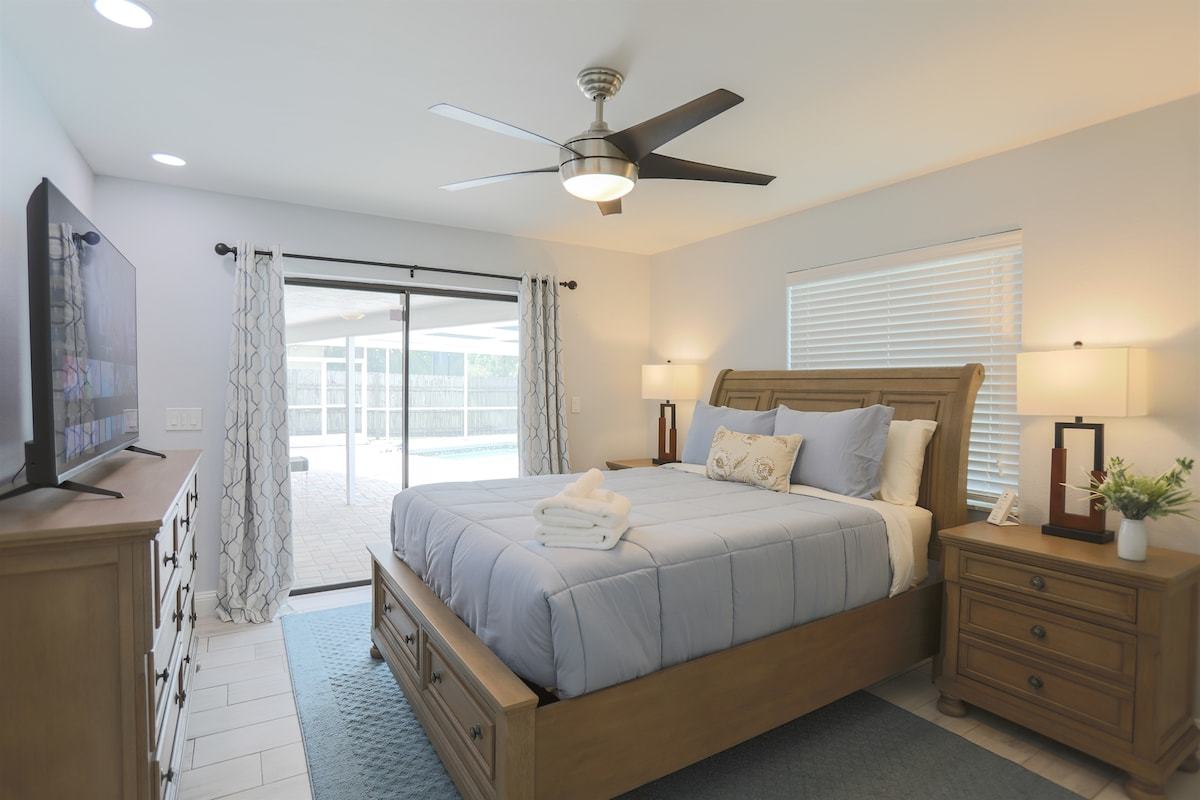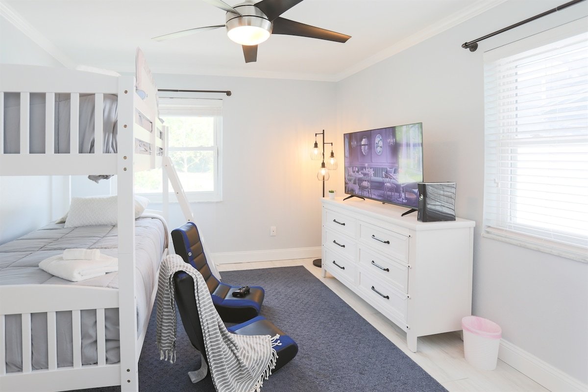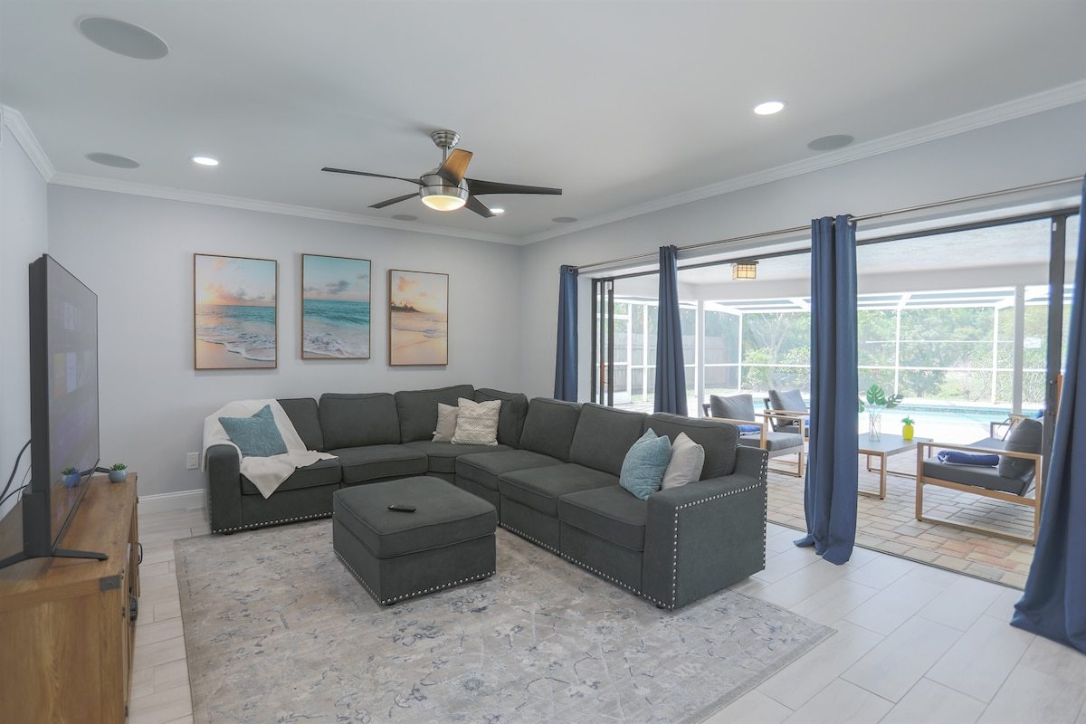 Relax at Sunset Poolhouse — a fully renovated 4 bedrooms retreat in Clearwater with a private pool, firepit, BBQ grill, outdoor seating, games, and sunset views over a serene creek (no rear neighbors!). Enjoy Xbox 360 in the bunk bed kids' room, smart TVs in all bedrooms, a full kitchen, and ample parking. Just 15 mins to Clearwater, Belleair, and Indian Rocks Beach!