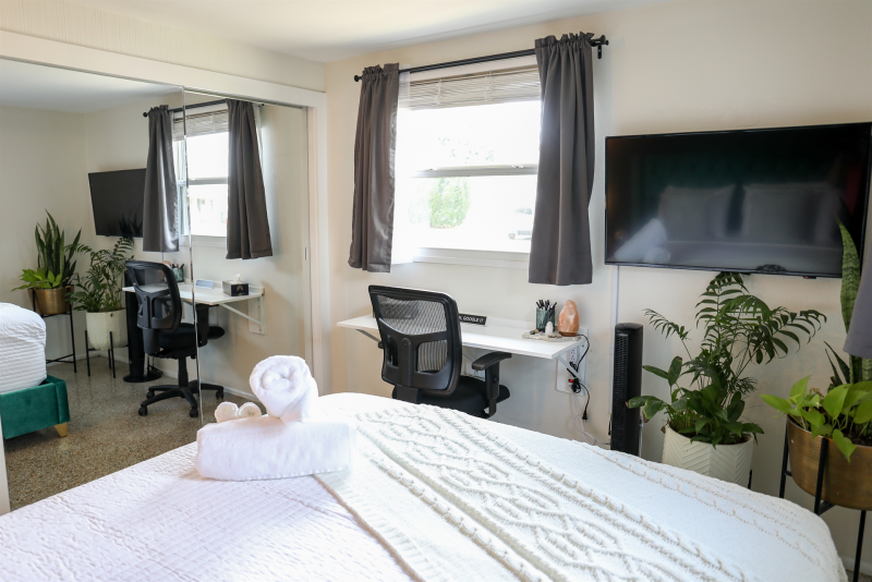 The master bedroom features a comfortable queen-size bed with linens and plenty of pillows to ensure a restful night's sleep. It also has a private workspace with a desk for any work needs. The second bedroom has a cozy queen-size bed, and we also provide a full air mattress for extra guests.