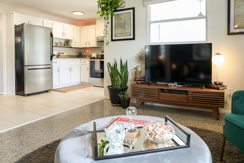 The living room is equipped with a smart TV for entertainment, and for those who love vintage video games, we have a classic arcade game console available for your enjoyment. The dining room has a beautiful wooden table that seats four, where you can enjoy meals or play board games.