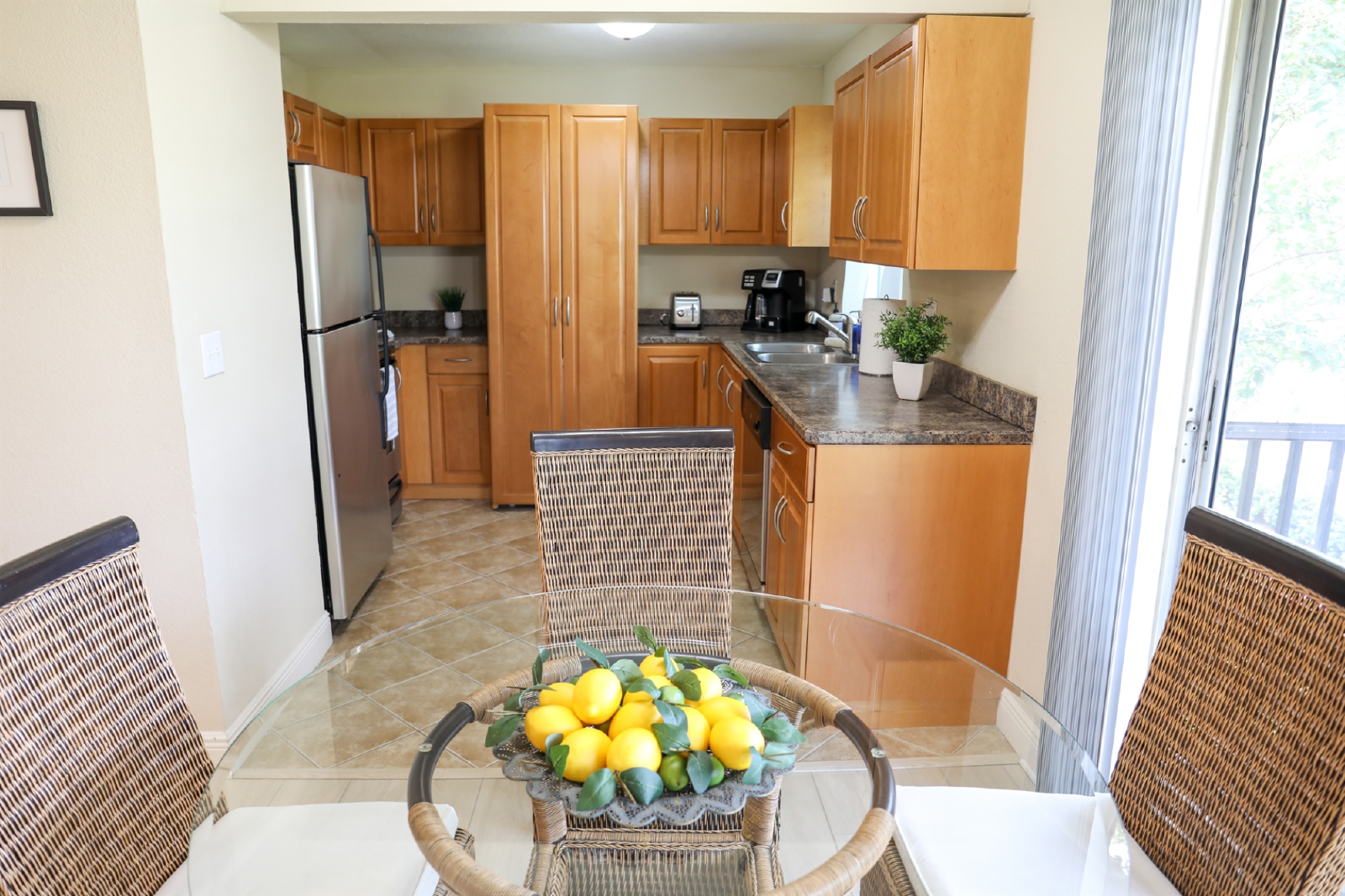 The fully equipped kitchen has ample space to prepare delicious meals. Whether you're brewing your morning coffee or whipping up a gourmet dinner, the kitchen has everything you need. Enjoy your meals at the dining table with seating for four, or take advantage of the balmy Florida weather and dine alfresco on the private balcony, where you can relish in the views of lush greenery and enjoy the gentle breeze.